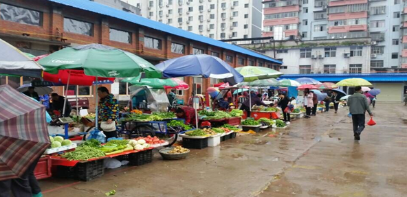 为整治吴都古肆一带以路为市,占道经营,乱摆摊点,解决城市管理老大难问题,市政府决定在老鄂州汽校建设市容临时疏导场所,根据市政府要求,公司克服汽校搬迁等各种困难建设农贸市场。今年元月农贸市场开始施工,一期工程于4月底建成。5月7-9日,市城管局和古楼街办联合执法,200多间商棚全部拆除,130多户经营户迁入大通农贸市场。为了帮助新开市的农贸市场管理,公司在全公司范围内抽调10名管理骨干成立工作组进驻市场维护市场秩序。通过上下努力,目前,市场经营逐步走入正规,市场二期工程也正在加紧建设。图为农贸市场经营场景。