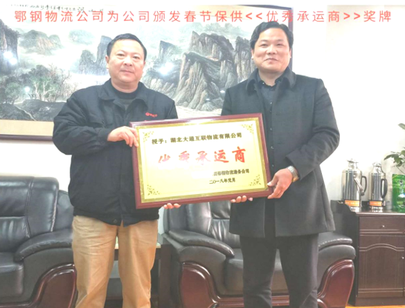 2月23日,鄂钢物流港务公司总经理吴文勇专程来到大通公司,向我公司授予"优秀承运商"牌匾。